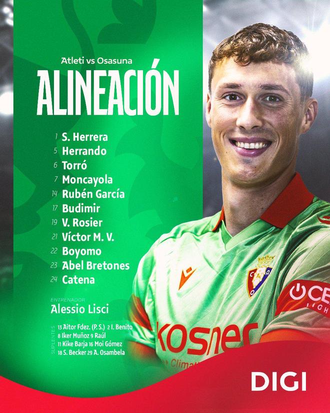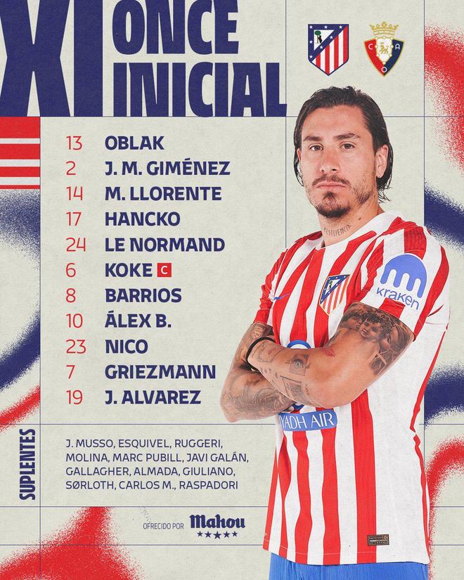 马竞vs奥萨苏纳:格子、小蜘蛛联袂首发,小西蒙尼替补